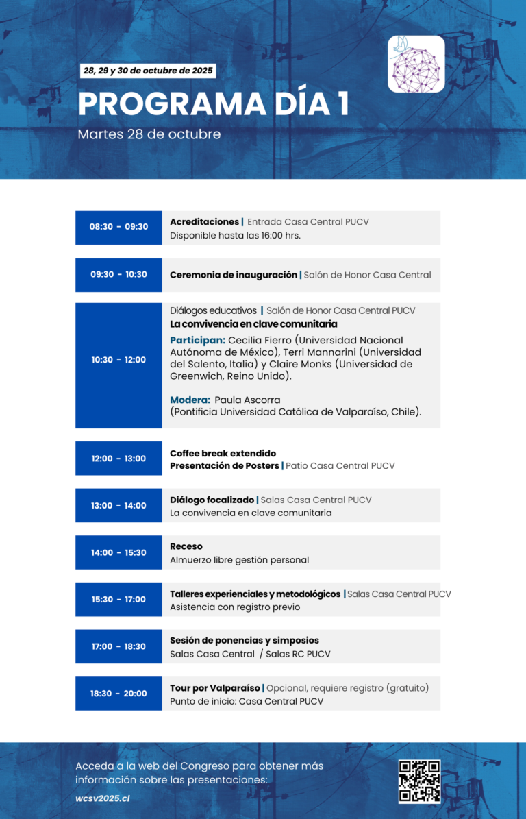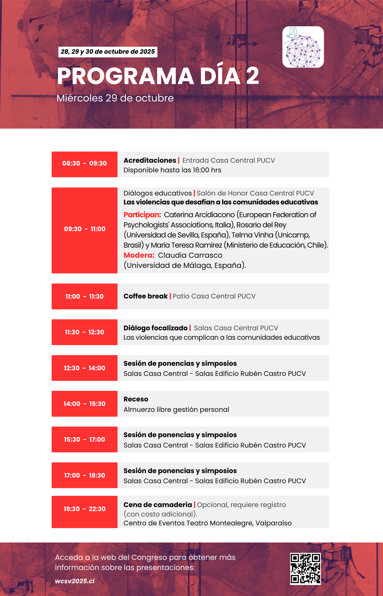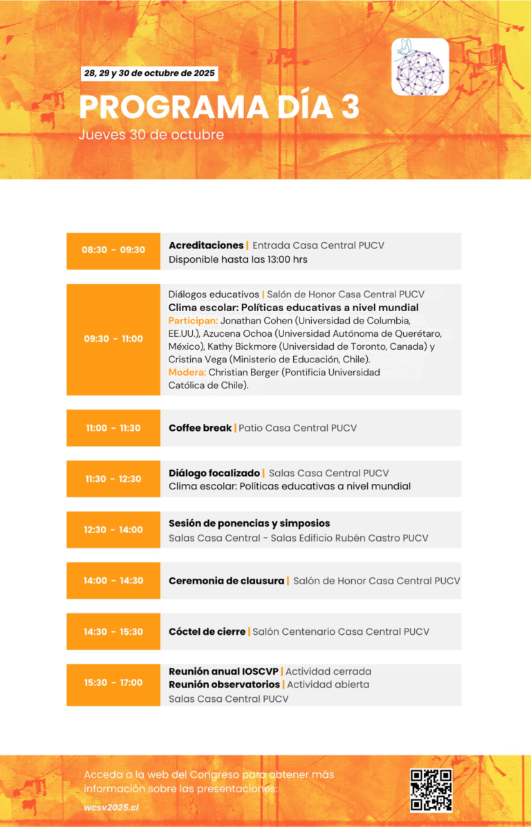 Nos complace presentar el 10º Congreso Mundial sobre Convivencia y Violencia en la Escuela que se realizará los días 28, 29 y 30 de octubre, en la Casa Central de la Pontificia Universidad Católica de Valparaíso. “Diálogos que fortalecen comunidades educativas y territorio”, es el lema de la versión 2025 de este encuentro bianual que es organizado por el Observatorio Internacional para el Clima y la Prevención de la Violencia Escolar (IOSCVP) y el Centro de Investigación para la Educación Inclusiva –liderado por la Pontificia Universidad Católica de Valparaíso–, en colaboración con otras universidades a nivel nacional e internacional y la Red Latinoamericana de Convivencia Escolar, entre otras instituciones.